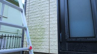 日当たりが良くない道路に面した北側の外壁は、緑色の汚れが付着しやすいです。今までにも数回ブラシで擦って綺麗にしましたが、また一部の外壁が緑色に変色してしまいました。ブラシで擦って汚れを落とすことにしました。背の高い脚立やデッキブラシを準備しました。