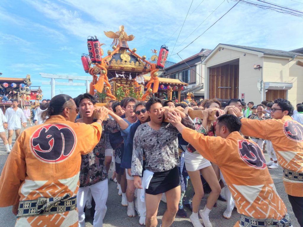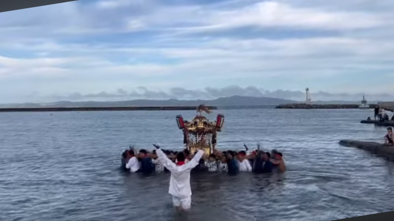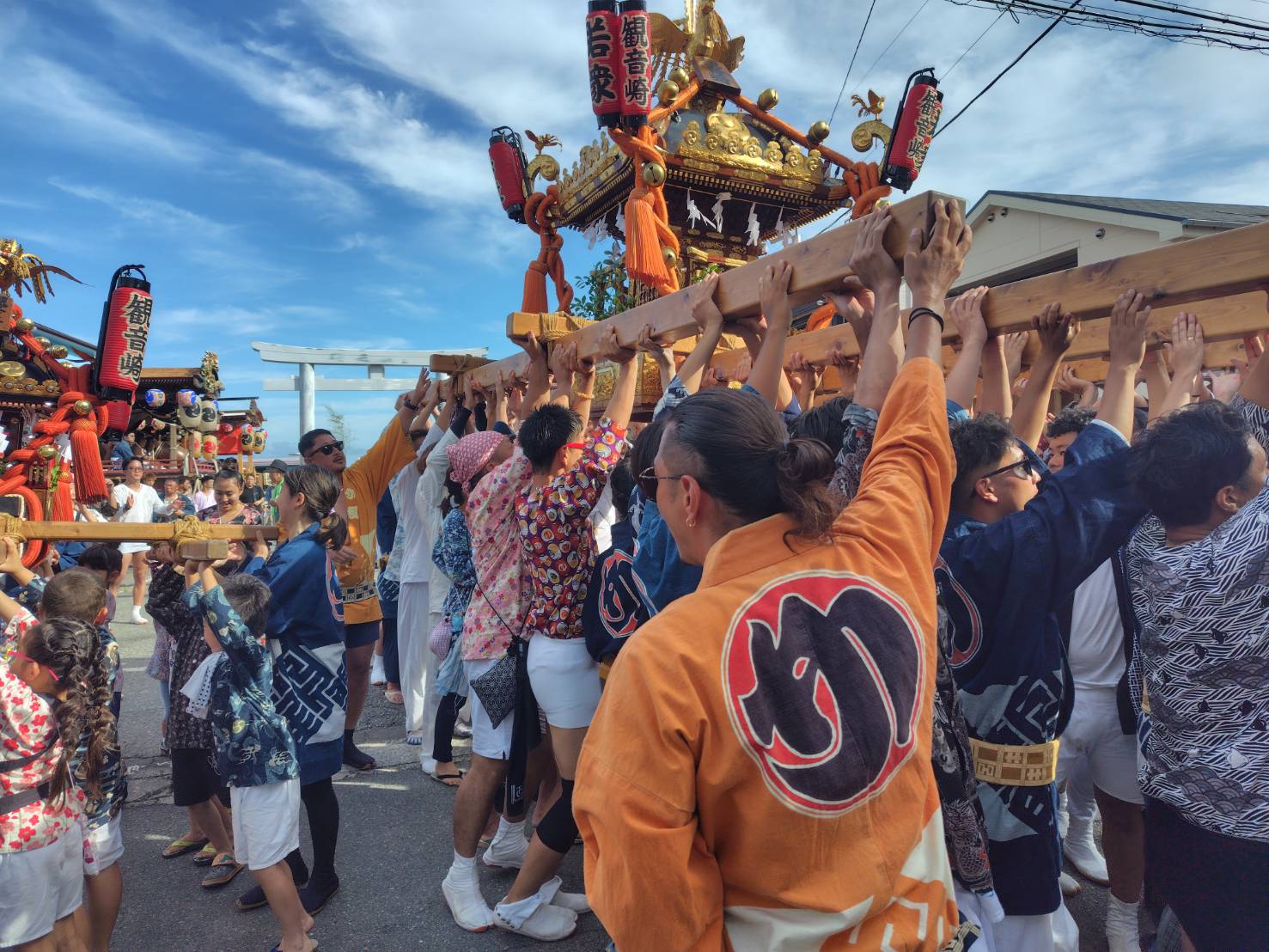神事の後は各町内の神輿が海岸に降りてきました。一部の町内神輿は担ぎ手が胸まで海水に使っています。 暑い一日でしたが、風が朝からずっと拭いてくれたので、熱中症で運ばれる人などの大きな事故も無く、無事に熱いお祭りが終わりました。ではまた