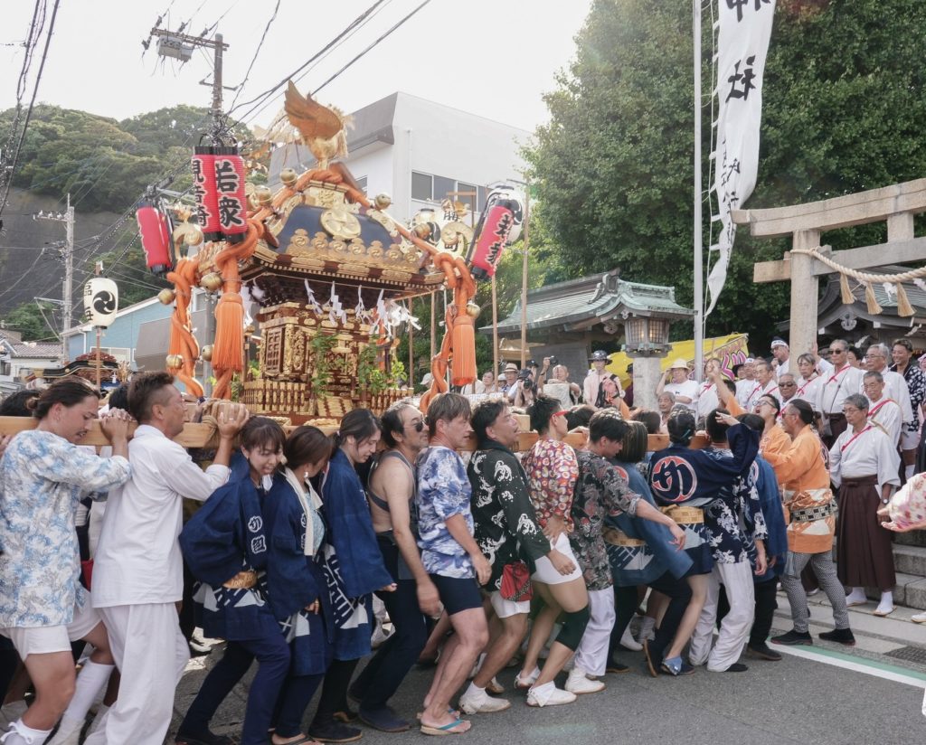 その後白装束の担ぎ手が神社神輿を担いで浜に向かいます。浜に氏子総代がこの日の朝に作った御仮屋で神事がしめやかに行われました。最後は周囲の見物客めがけてお餅を投げて終了しました。
