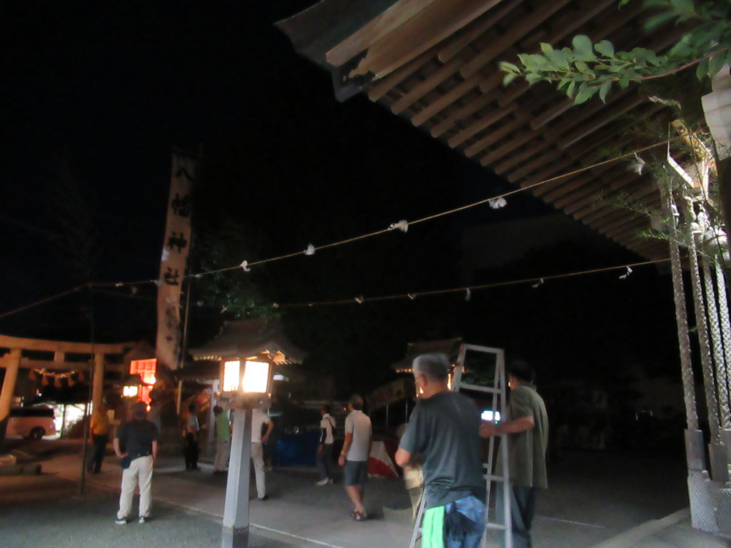 各町内の氏子総代と若衆頭が25日19時に集合して、神輿蔵から神輿を出したり、しめ縄張りの作業をしました。