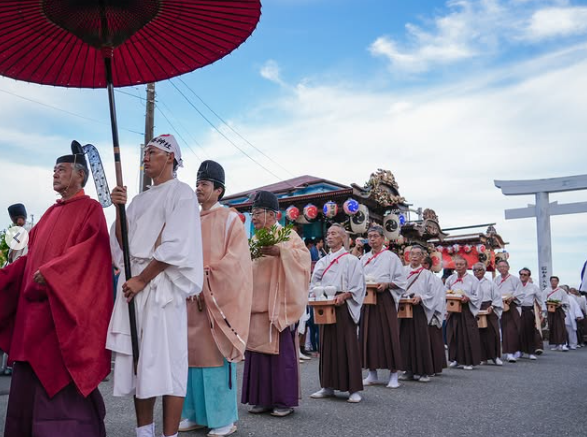 各町内の宮入が終わり、次は海岸の砂浜で神事を行います。 神主を先頭に、氏子総代が供物をもって神社前の砂浜に向かいます。一番目がお酒、2番目の私はお餅の担当です。なをこのお餅は翌日の後片付けが済んでから、神社が小さく切って作業に来た氏子総代に配ってくれました。我が家では妻とありがたく頂きました。