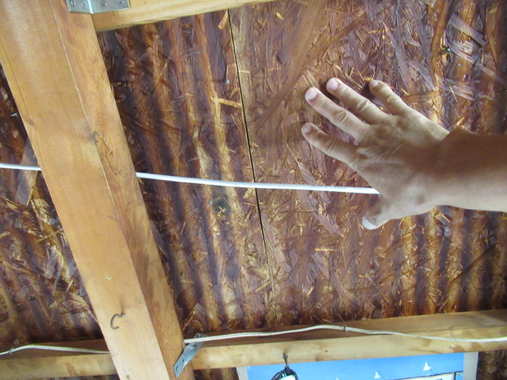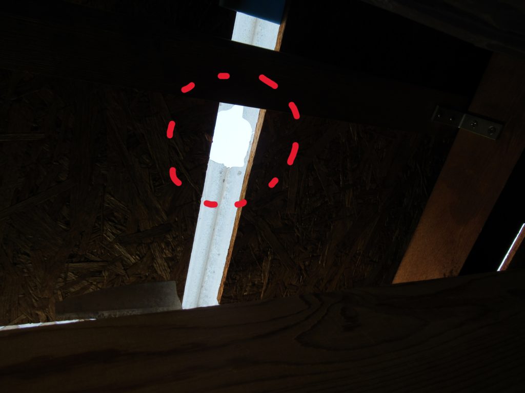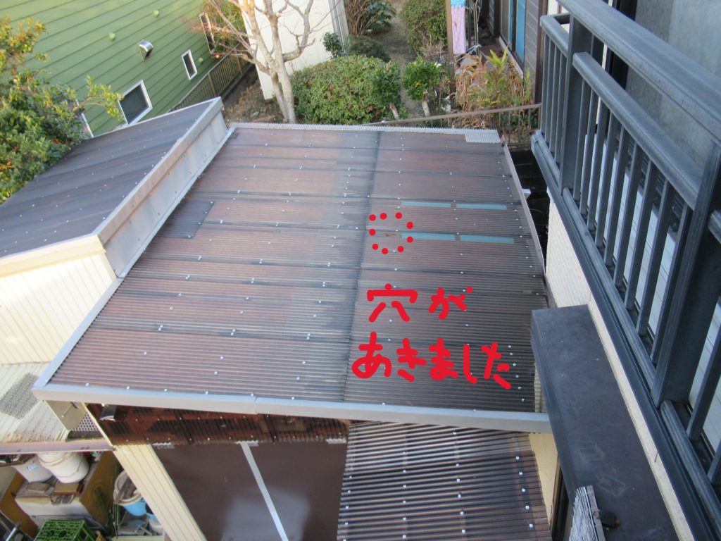 ガレージの葺き替える前の屋根です。ベニヤ板の間隔を開けて明かりが取り込めるようにしていました。しかし、ちょうどその隙間にカラスが硬いみかんを空から落として穴が開きました。