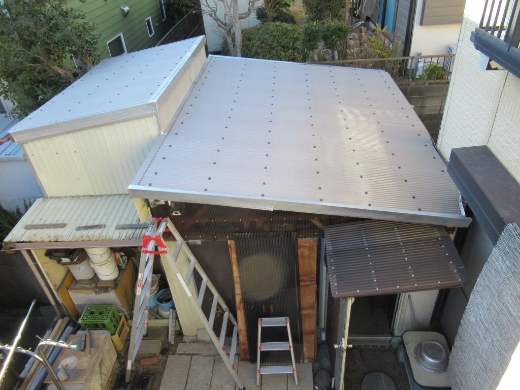 そして、ポリカーボネート波板の代わりにガルバリウム波板を使いました。これでかなり長持ちする屋根になったと思います。