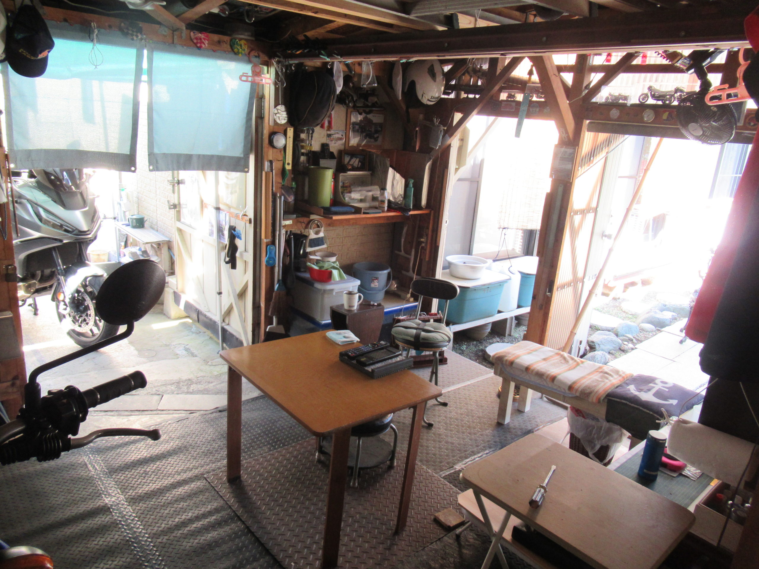 屋根を葺き替えてから、初めての真夏を迎えました。横須賀でも毎日最高気温は35度近くになっていて、暑いです。 ガレージは駐車場側の大扉、庭側の出入りする時のドアと上に開く大扉を開けて、庭側から吹いてくる海風をガレージ内に取り込んでいます。