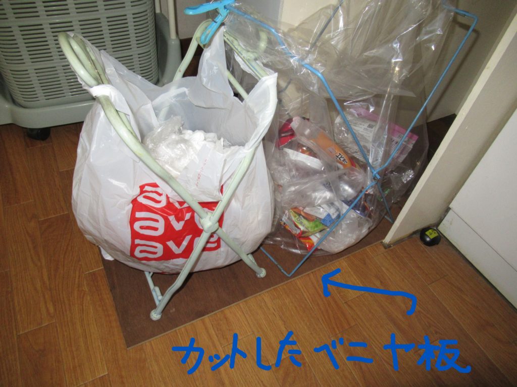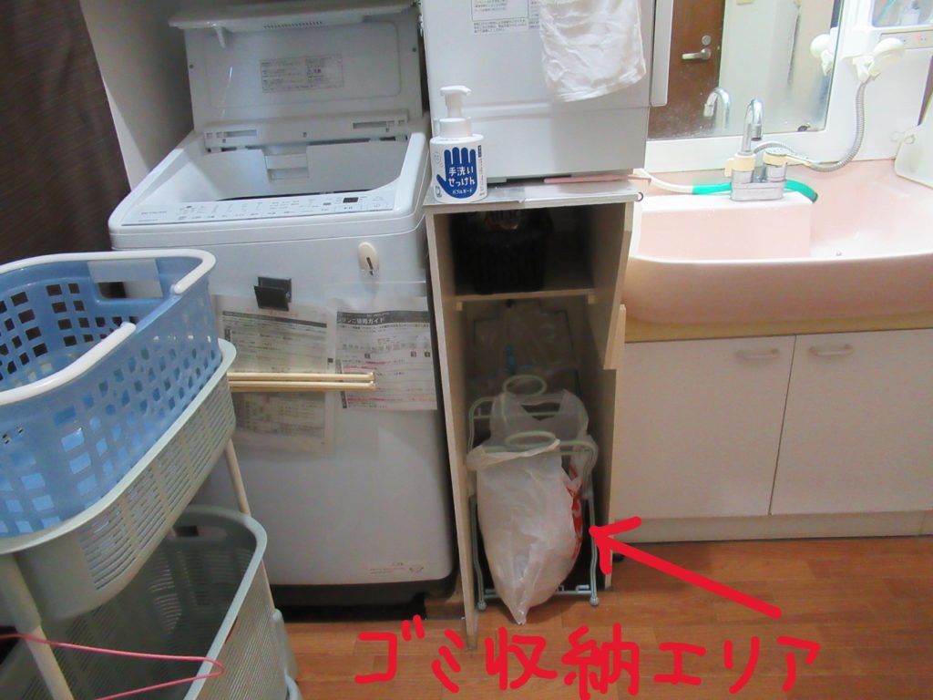 ゴミの収納エリアには手前に燃えるゴミ、奥にビニールゴミの袋を置いています。このためビニールゴミを捨てる時は、燃えるゴミの袋を引っ張り出して奥に置いてあるビニールゴミの袋に入れる必要がありちょっと面倒でした。