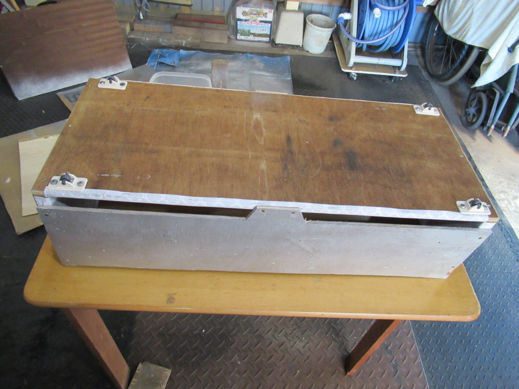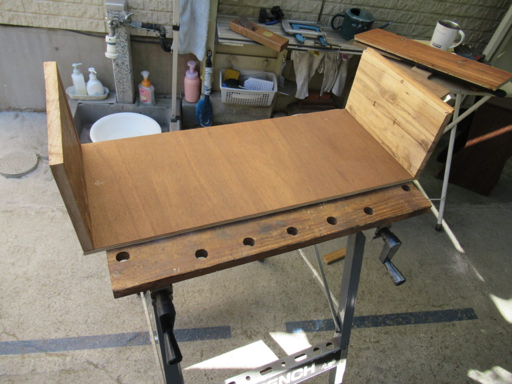 台にするベニヤ板の前後に仕切りの板を取り付けました。おふくろの桐のタンスを分解処分した時の桐の板です。厚手でも軽くて仕切りに最適です。