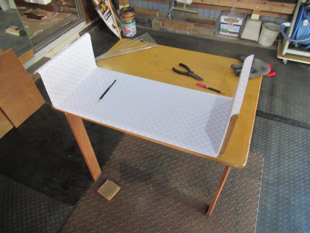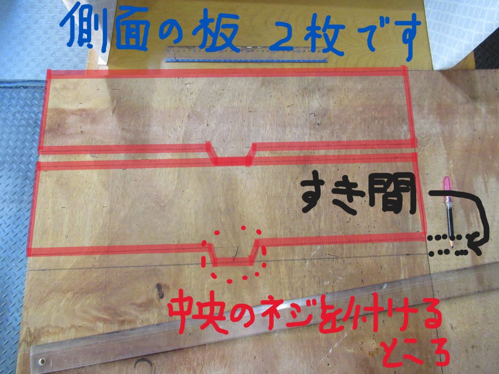 次に台の左右に取り付ける仕切りに使うパーツを作成します。 強度は必要ないので薄いベニヤ板を使って線を引きました。仕切り板で台の中を塞いでしまうと掃除をする時に手間がかかるので、仕切り板の下には隙間を設けることにしました。 これで、台の底にゴミが溜まっても履き出すことが出来ます。