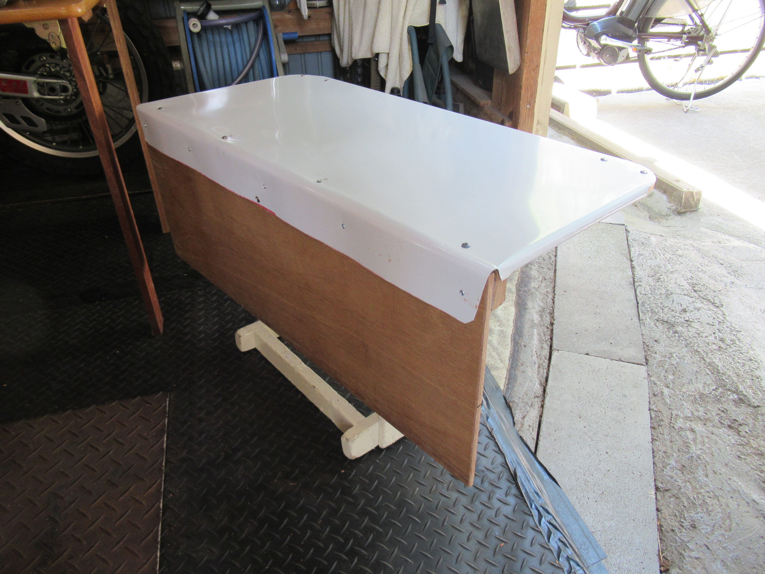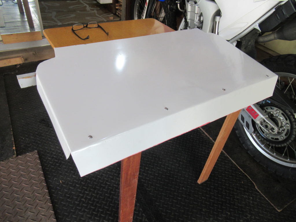 鉄板は分解処分した大型冷蔵庫のボディカバーを切り取った物です。ブリキ版より厚みがあって折り曲げるのが大変ですが、少しずつ曲げたら形になってきました。 表面の塗装が綺麗で錆びにくそうです。
