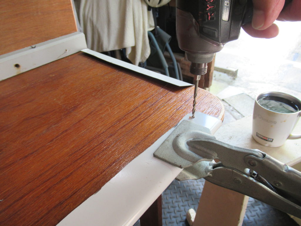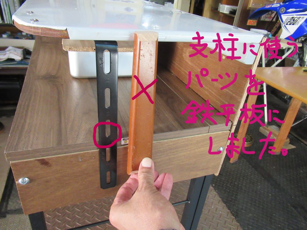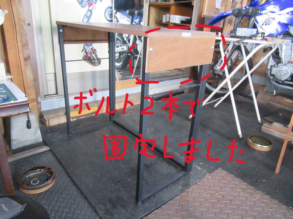 テーブルの支柱に電動ドリルで穴を開けて、ボルトで板を取り付けました。片面4本のボルトを考えていましたが、支柱を支えるだけの板なので、2本で十分です。
