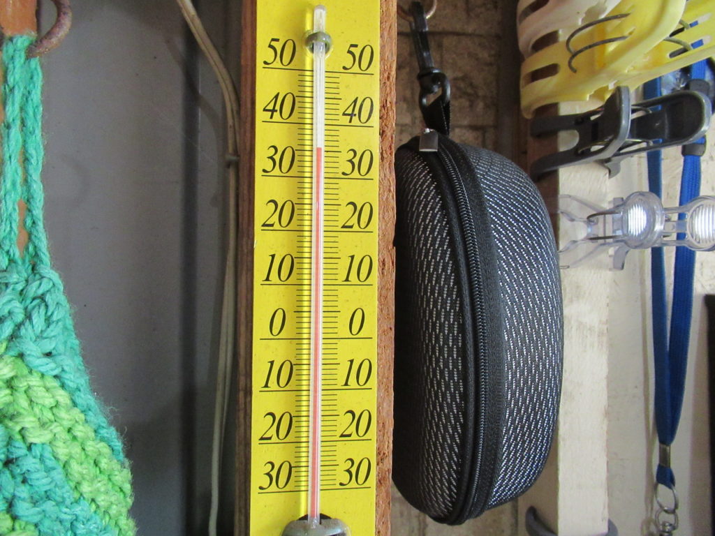 この日は猛暑で、ガレージ内の温度計は35度を差しています。 しかしガレージの扉を全て全開にして海からの風を取り入れて扇風機も回しているので、汗は掻きますが作業はそれほど苦になりません。