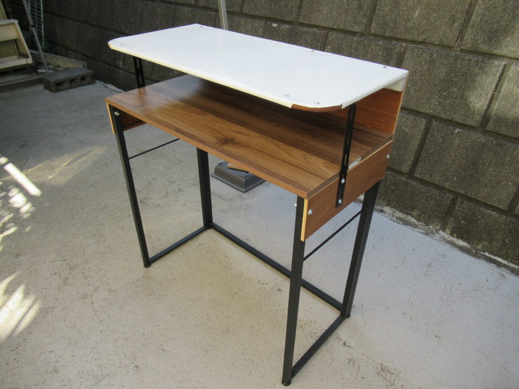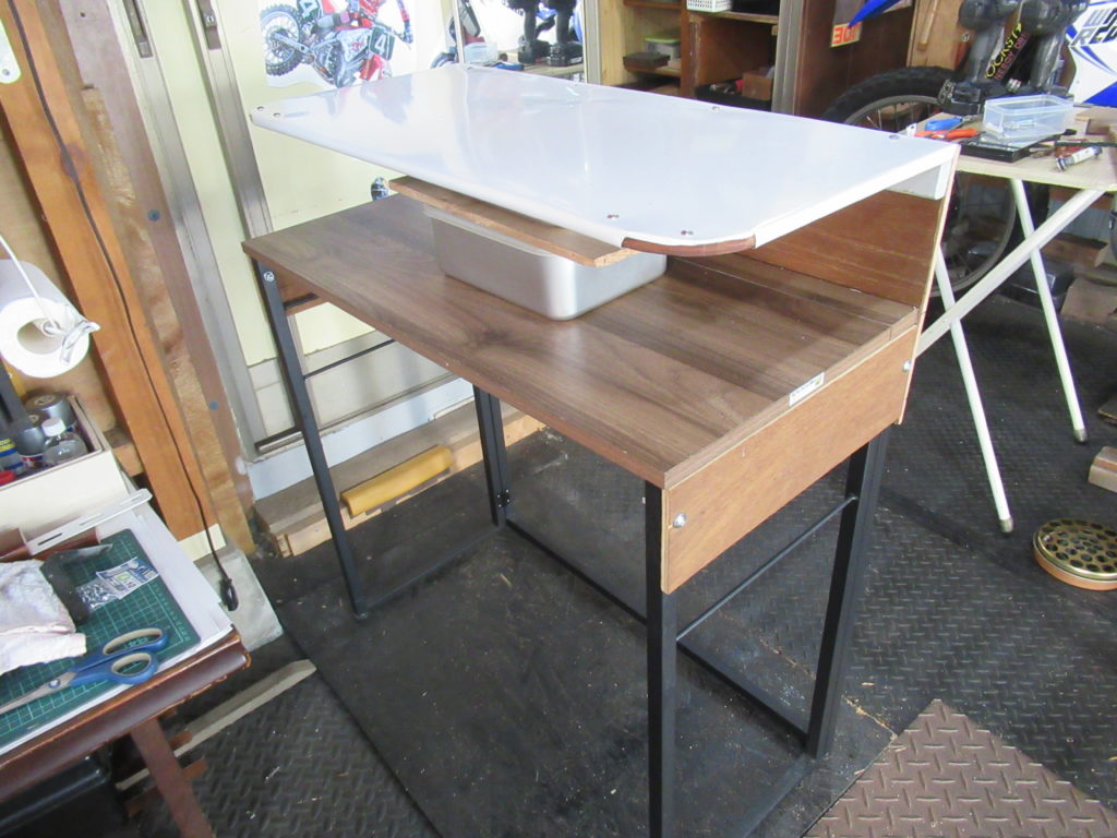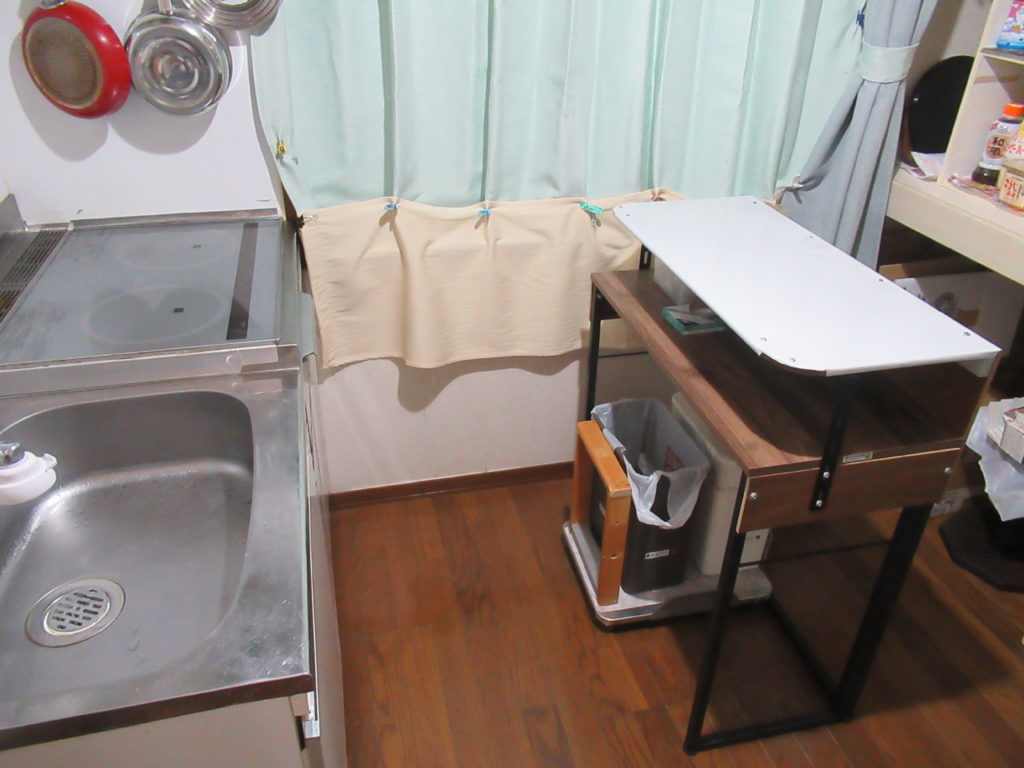 テーブルに取り付ける棚を仮置きしてみました。まだネジで留めていないから、倒れないように棚の下に物を置いて支えています。テーブルの天板と上部の棚との間隔は15㎝にしました。 間隔を広くすると棚の位置が高くなって妻が使いにくくなるし、間隔が狭すぎるとテーブルに物が置けなくなります。このくらいの間隔がちょうど良さそうです。 使ってみて高さに問題が出るようなら、調節できるように棚の固定はネジだけにします。