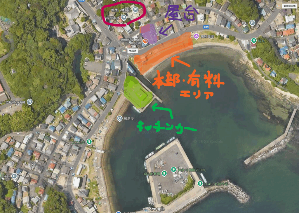 グーグルアースで確認すると、このような感じです。鴨居神社のすぐ前の海岸が鴨居港です。