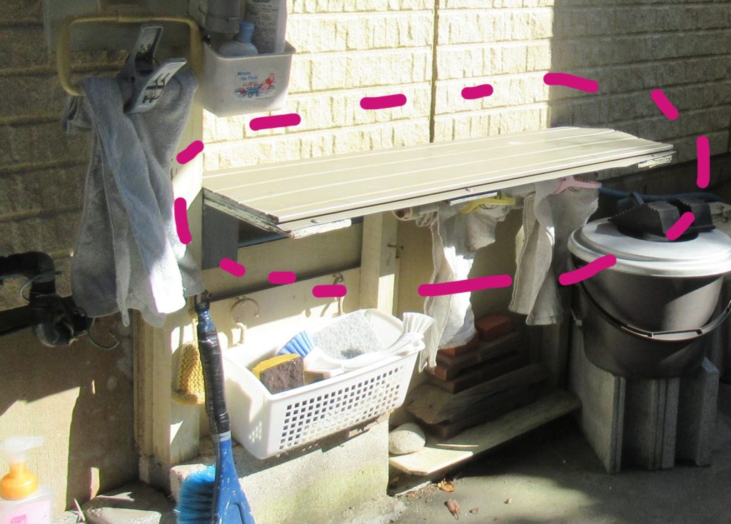 ホースは外水道の横に作成したタオルかけの屋根にしている棚の間を通ってガレージに行っています。ホースを撤去するため、タオル掛けの屋根にしているパーツを外します。