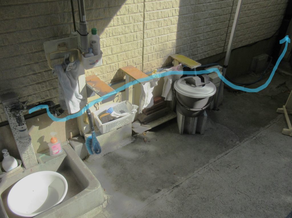 外水道からガレージ内の貯水槽へ青のラインで通しているホースを外します。