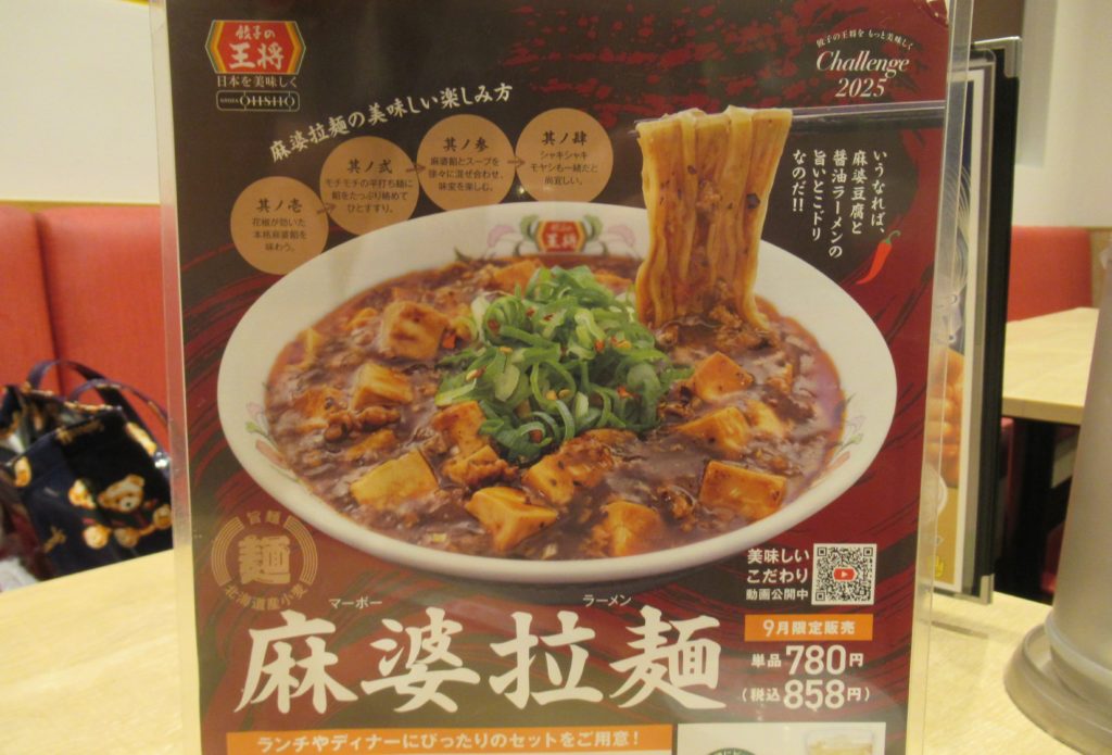 久しぶりに妻と二人で餃子の王将へ行きました。 9月限定の「麻婆拉麺」が目に留まりました。