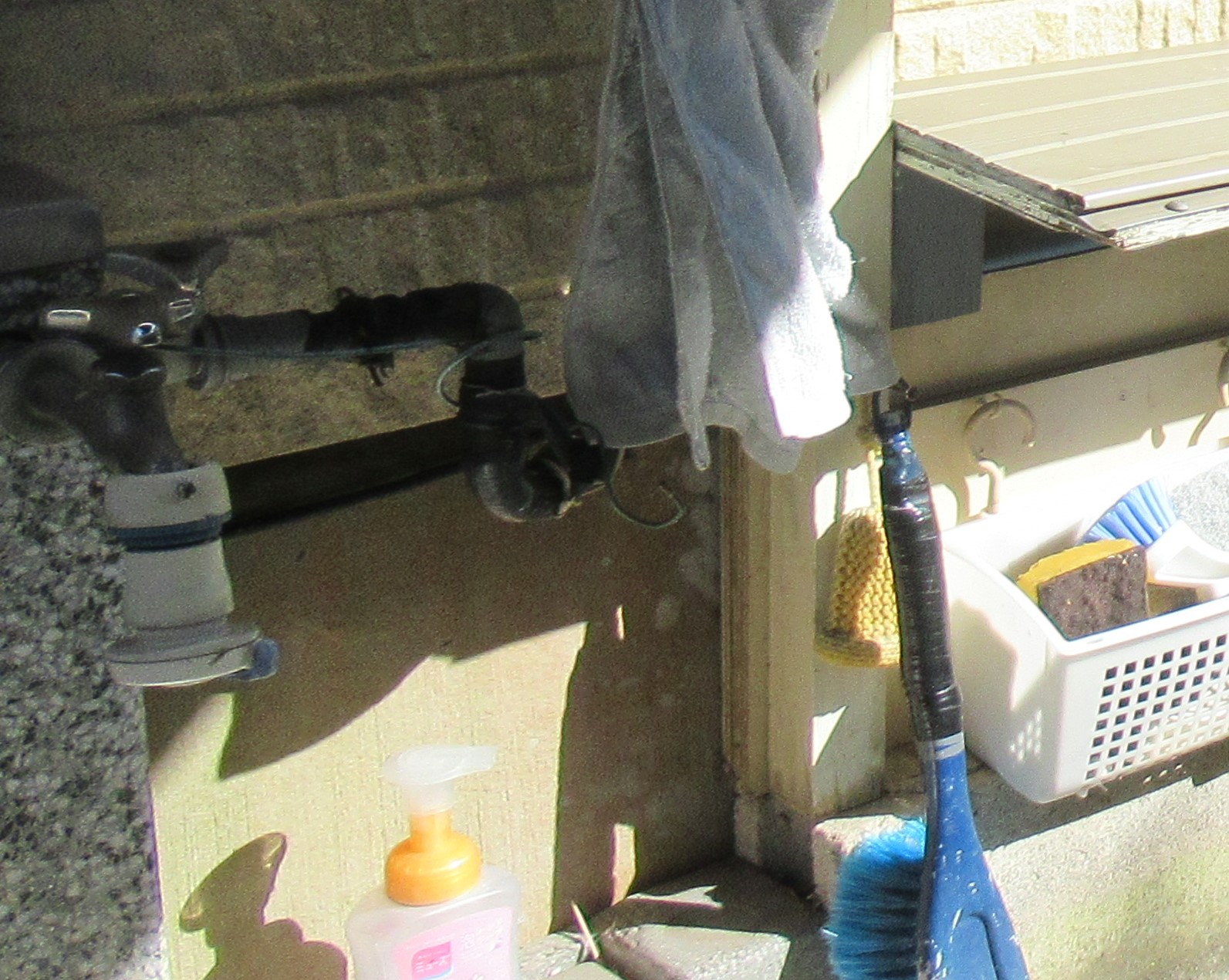 ホースは外水道の横に作成したタオルかけの屋根にしている棚の間を通ってガレージに行っています。ホースを撤去するため、タオル掛けの屋根にしているパーツを外します。