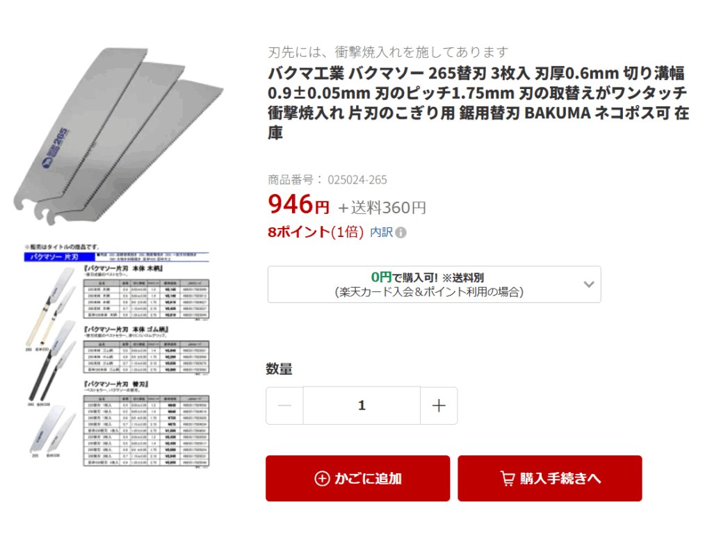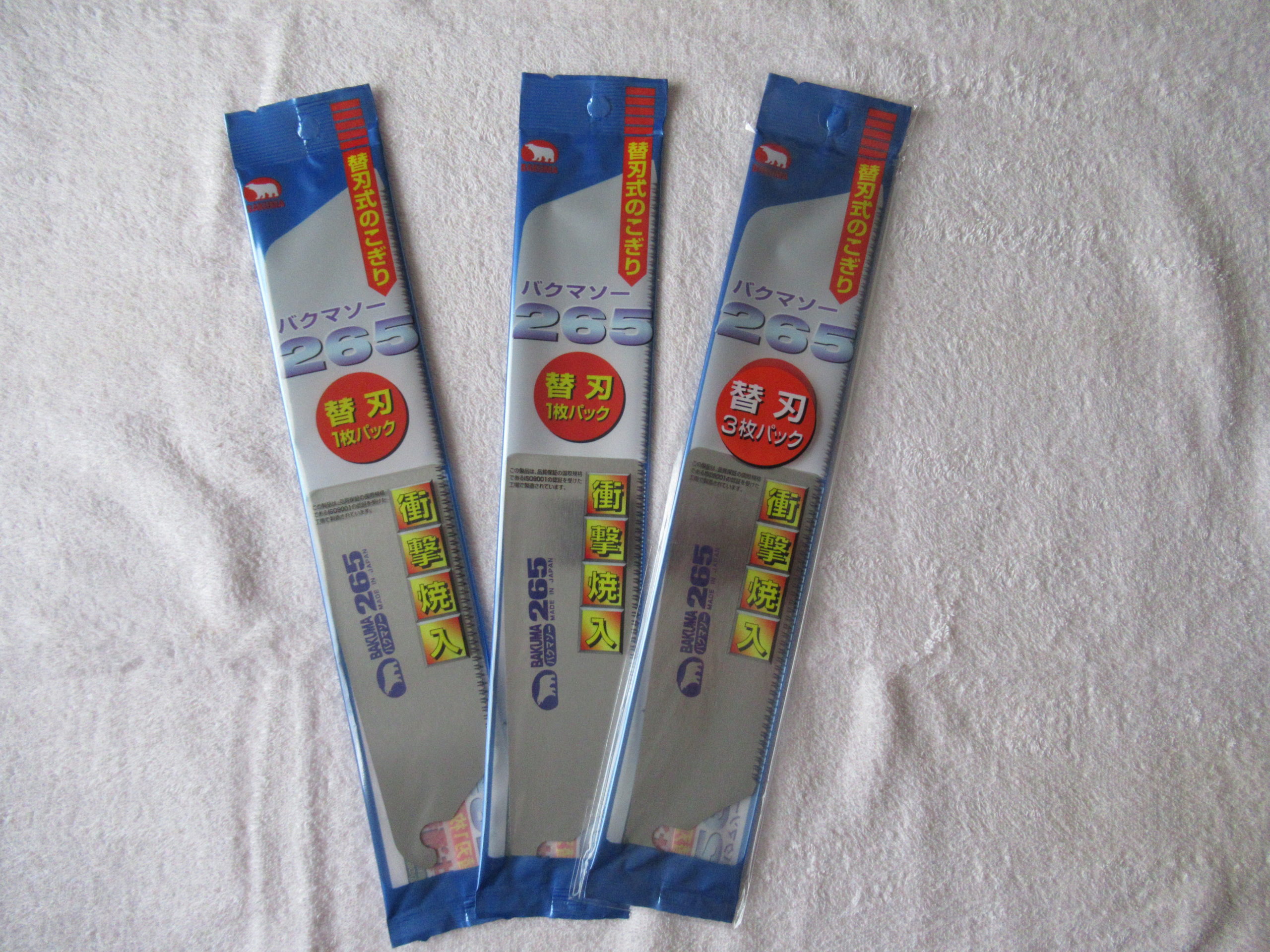 最近、インターネットで「バクマソー265」の横挽き用の替刃が売られているのを発見しました。縦挽きと横挽きの両方の刃が付いたノコギリよりかなり安いです。