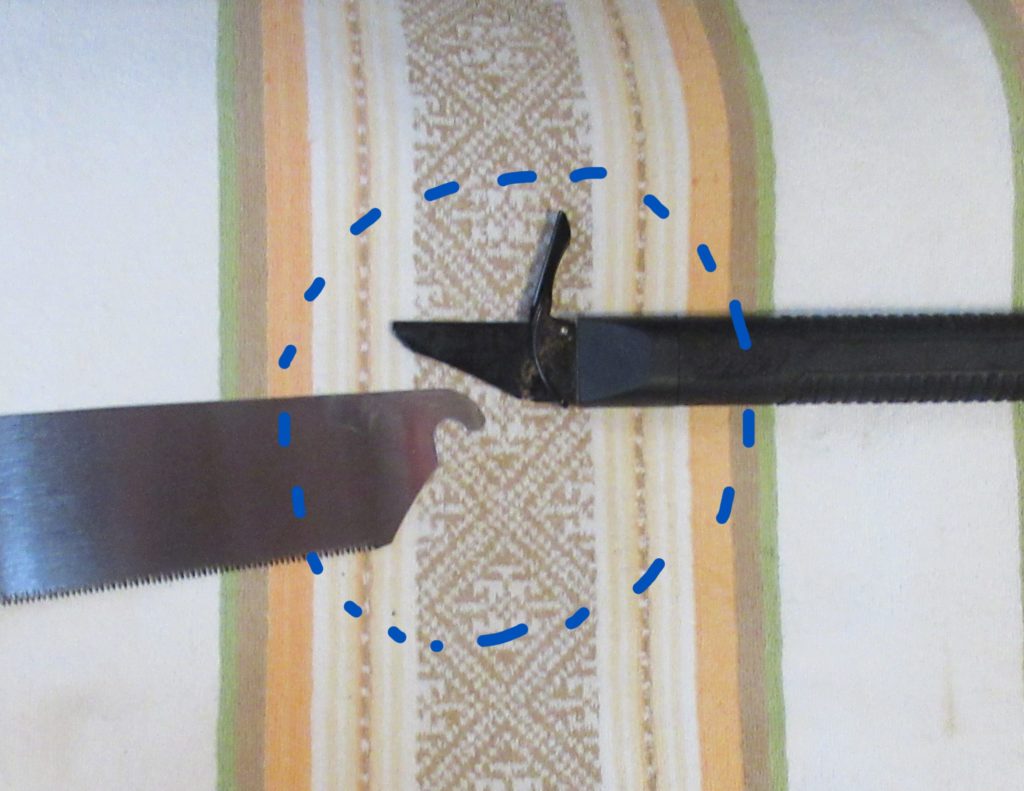 早速購入した横挽きの刃を柄に取り付けました。柄に刃を差し込んで、「安全ストッパー」をセットすると、刃と柄がピッタリ結合されます。