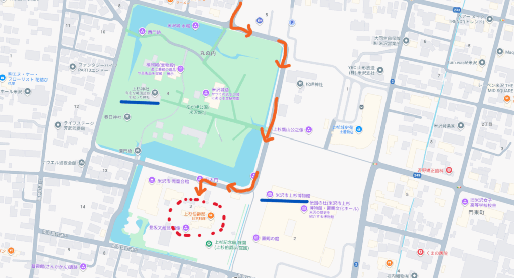 地図で確認すると米沢城跡のお堀を半周走った場所に「上杉伯爵邸」があります。