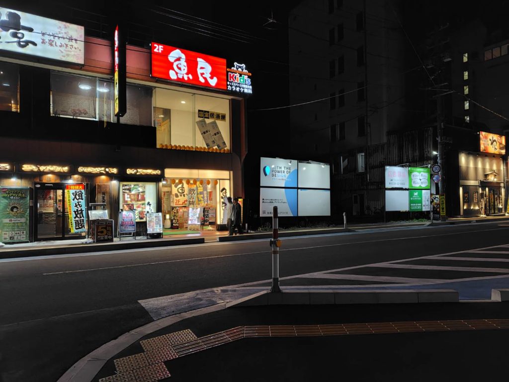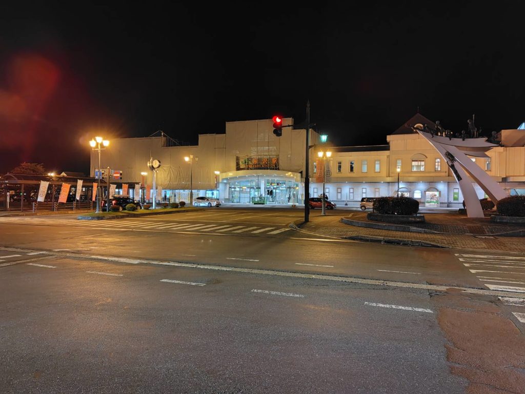 繁華街に到着しました。金曜日の夜にしては人通りが少ないです。関東でもなじみのあるチェーン店の居酒屋などが並んでいました。この日は3時半に起床して400㎞以上をバイクで走ってきたので、ホテルから2㎞以上も歩いて繁華街へ着いたら、かなり疲れが溜まってしまいました。タクシーを見かけなかったこともあり、ここで酒を飲み食事をして、また帰りに歩くのは大変だと感じました。