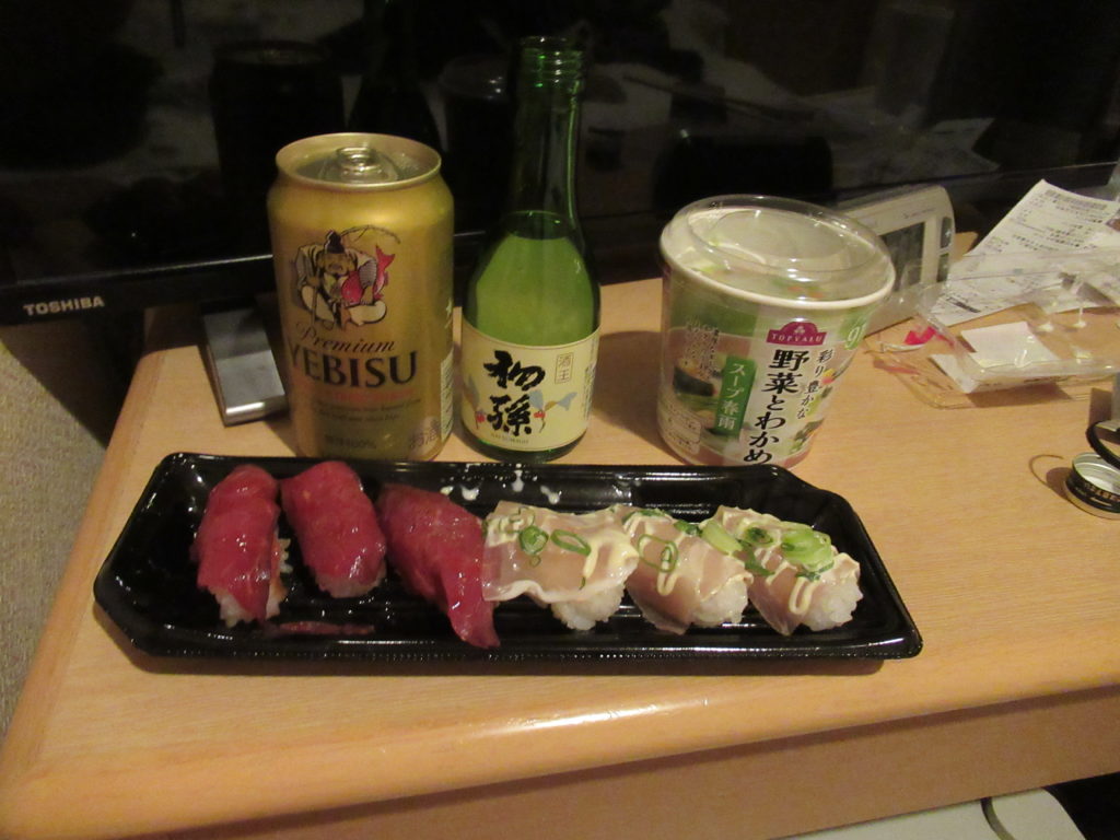 夕食はホテルの部屋でゆっくり食べることにして、歩いて帰りました。ホテル近くに24時間営業のマックスバリュウがあり、夕食や酒を買いました。「ローストビーフと生ハムの握り寿司」・野菜とわかめのスープ・地元の清酒「初孫」・エビスビールです。