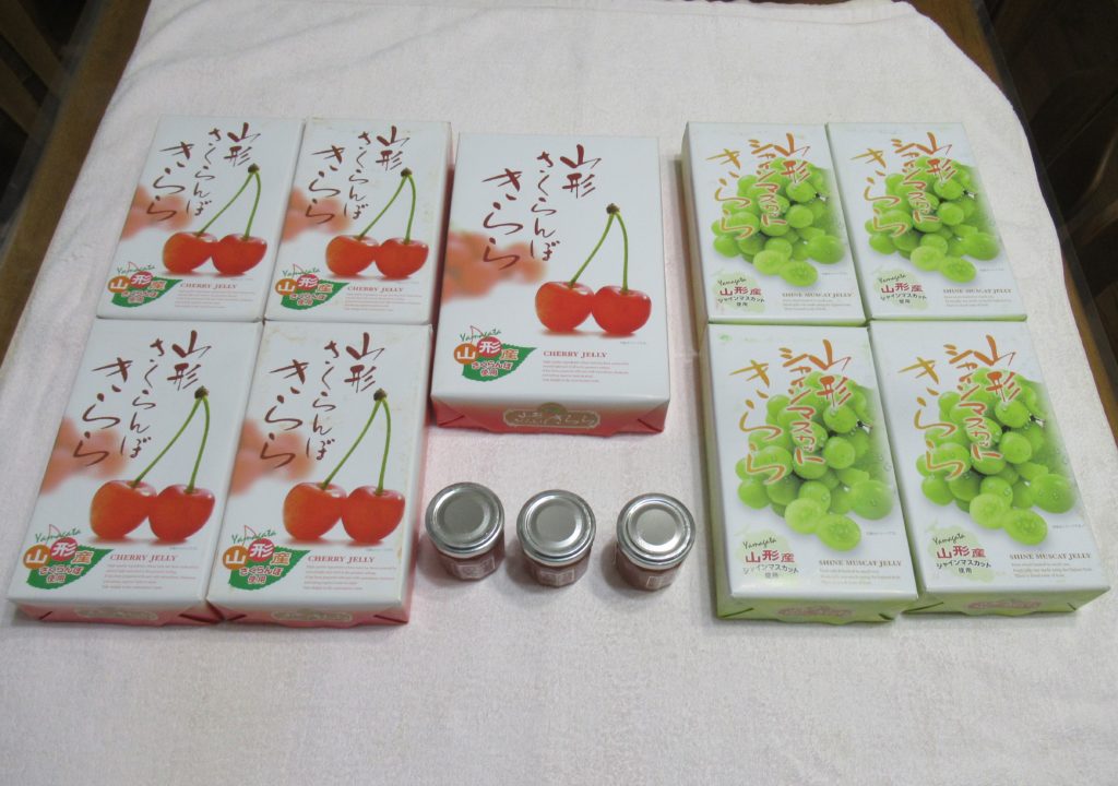 土産はサクランボとシャインマスカットのゼリー、それに瓶入りのサクランボジャムです。 近所や世話になっている人、家族への土産で、全部がバイクのパッセンジャーシートにセットしたケースに収まりました。