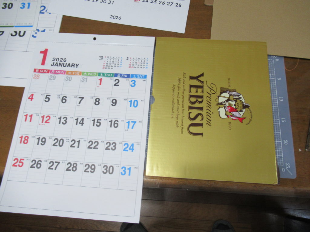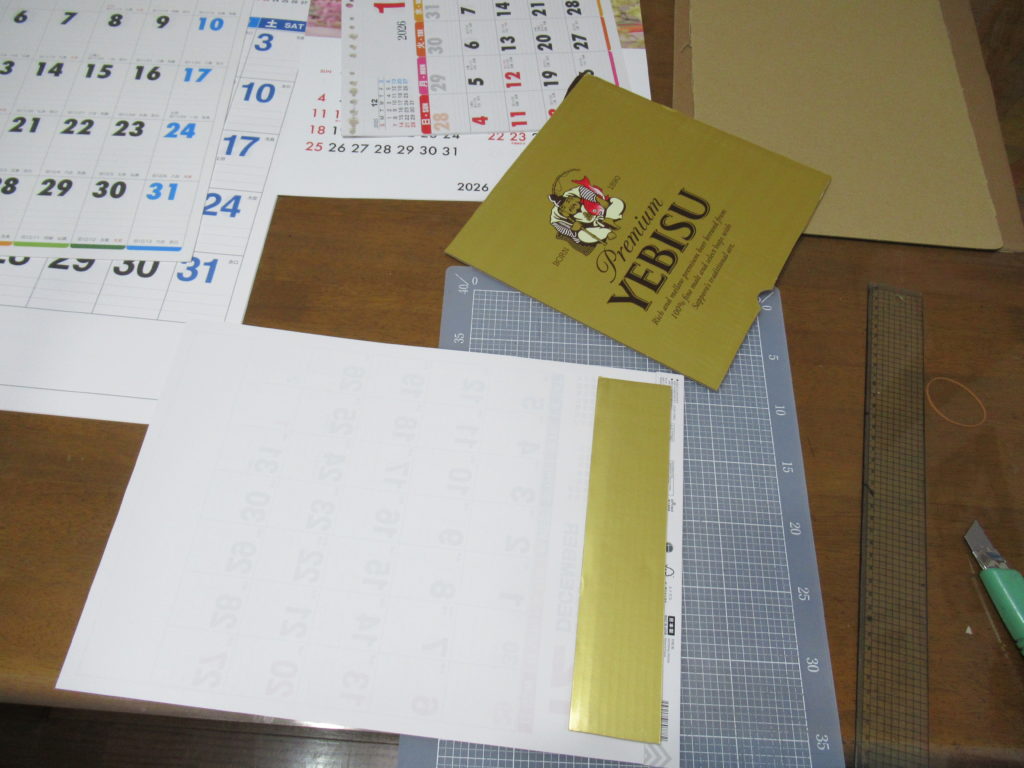 カレンダーが折れないように、厚紙で補強をします。シッカリしていて、しかも比較的薄手のダンボール紙をストックしておきました。贈答でいただいた缶ビールを入れていた箱です。重たい缶ビールを入れる箱なので、薄手でもシッカリしたダンボールです。