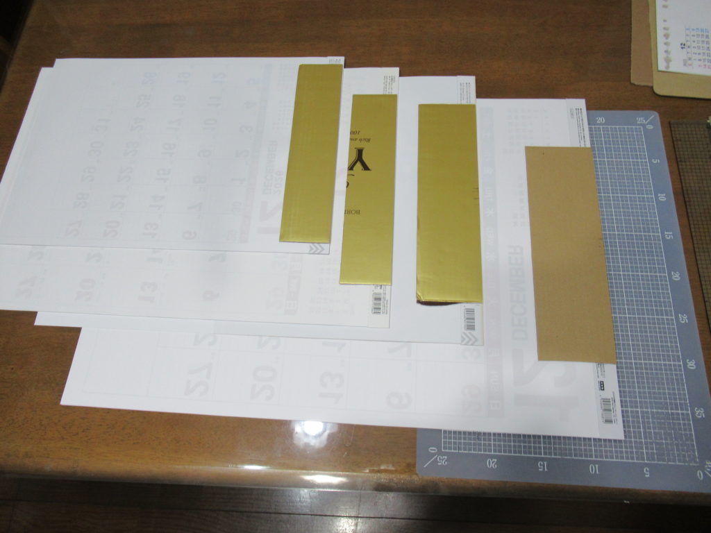 4つの大きいサイズのカレンダーに補強をしました。このあと、カレンダーにあいている穴と同じ場所に補強材にも穴をあけました。