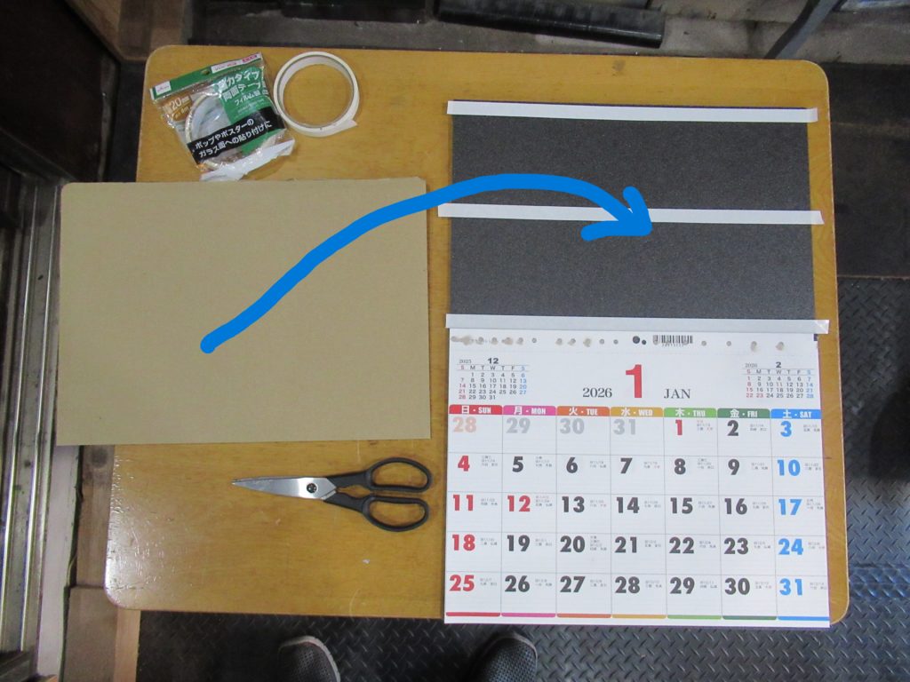背板にするボードにカレンダーを両面テープで貼りつけました。カレンダーは12枚綴りなので、このまま写真をボードに貼り付けると写真とカレンダーの境目に段差ができてしまいます。そのため、写真を貼る前に厚紙をボードに貼って写真とカレンダーがフラットになるようにします。