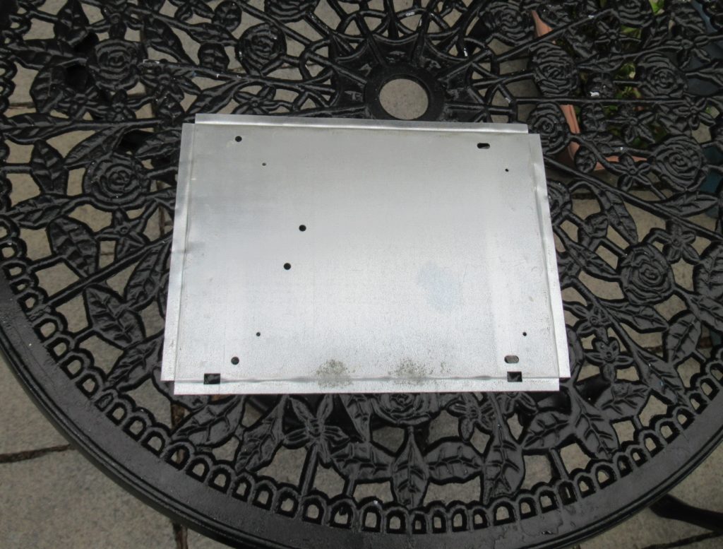 使うのは厚みがある鉄板です。 電気器具を分解廃棄した時に保管していた鉄板を使います。小さい穴がいっぱい開いていますが、気にせず必要な大きさに切り取りました。