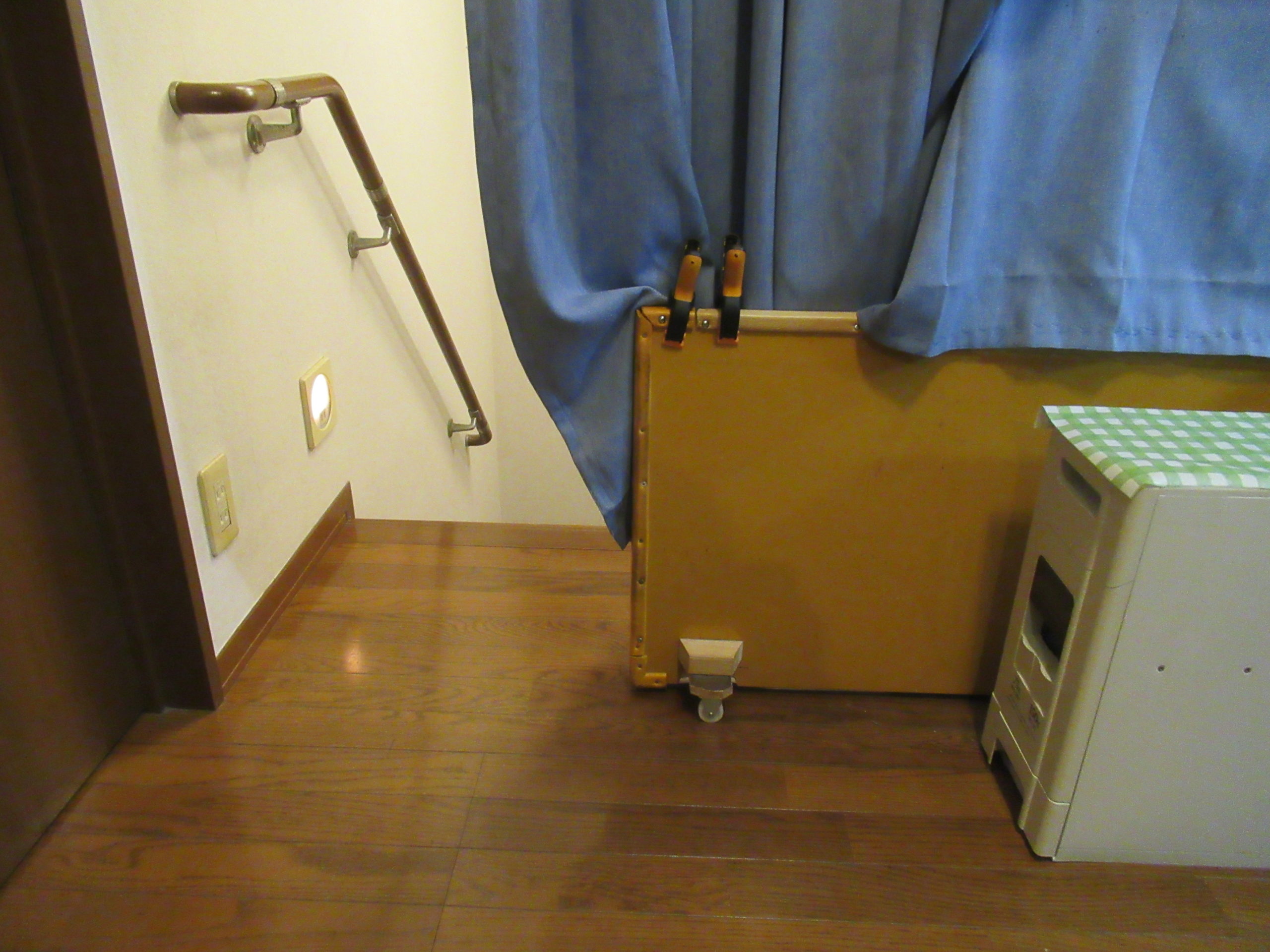 私と妻が主に生活場所としている自宅2階の階段付近です。カーテンと仕切り板はスプリングクランプ2個で繋いでいて、カーテンと仕切り板のどちらを動かしても開けたり閉めたりできます。