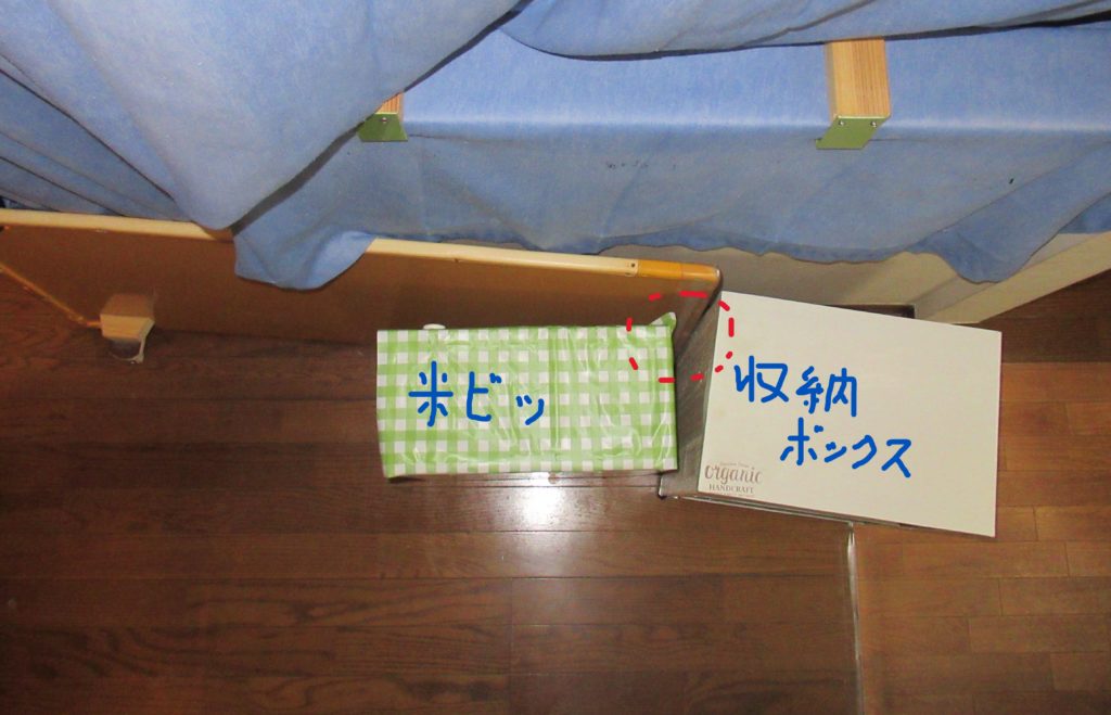 通路に米びつと収納ボックスを並べて置くと、写真のようになります。