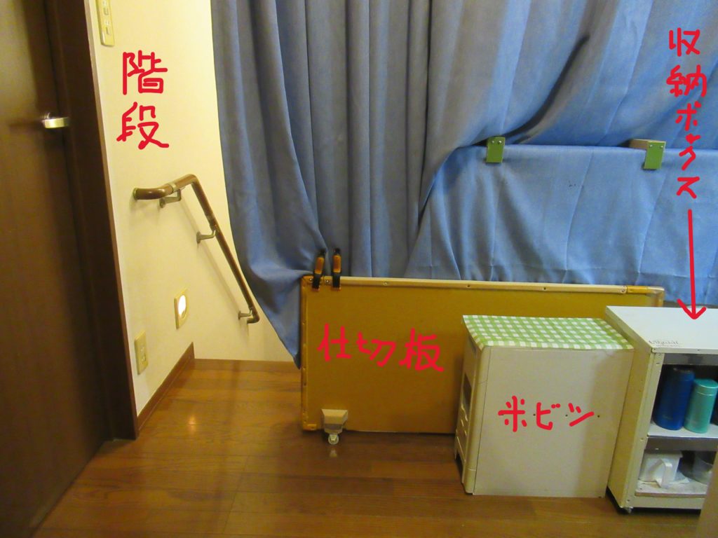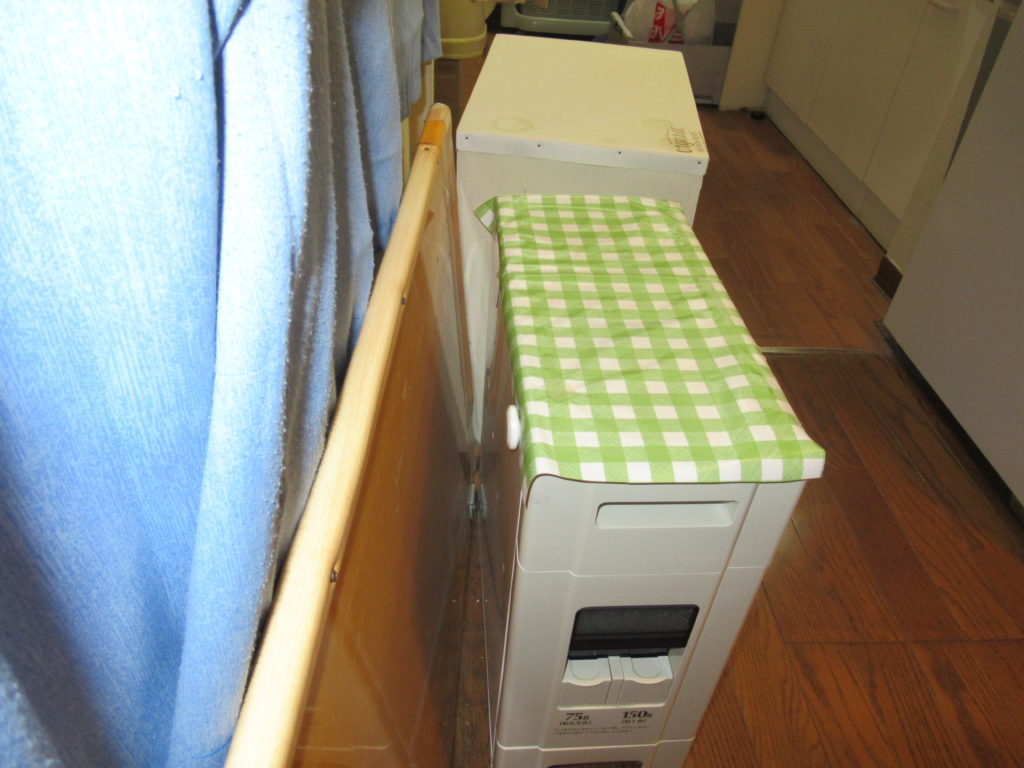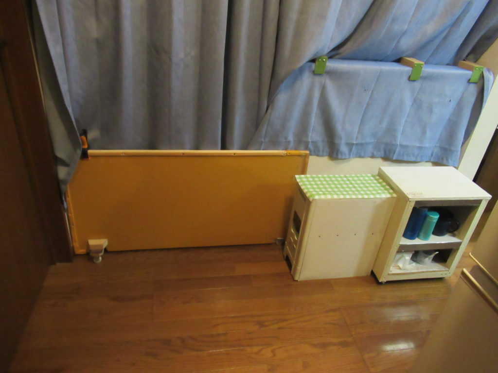 しかし、困ったことに仕切り板を開ける時、仕切り板が階段の壁付近に設置している収納ボックスに当たってしまうことがあります。 こうなるとカーテンを大きく開けることができないし、キャスターが付いている物入れは簡単に動いてしまいます。