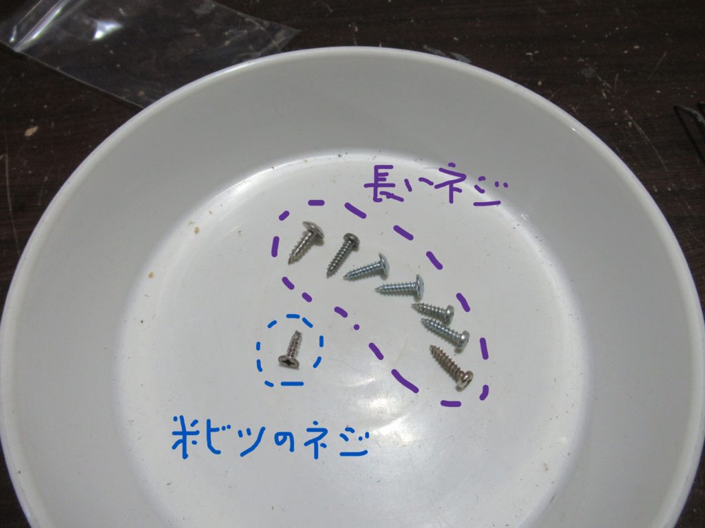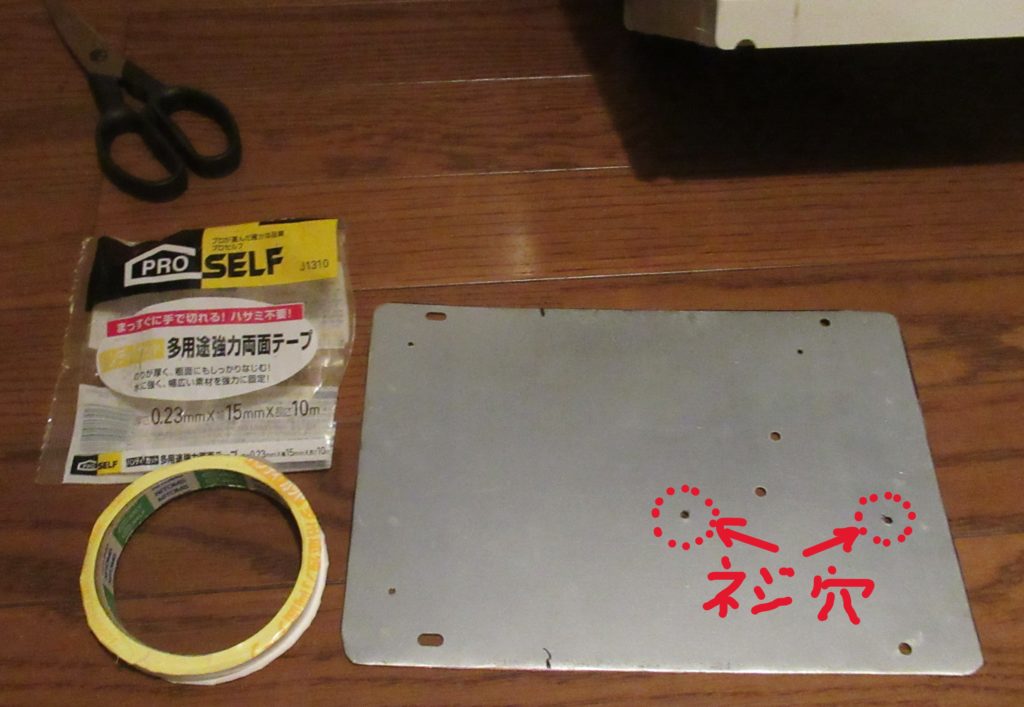 米びつの背面にこの鉄板を貼り付けます。両面テープだけでは鉄板の重さではがれてしまいそうなので、米びつに付いているネジを利用します。鉄板の上からネジを締めるので、少し長いネジを準備しました。