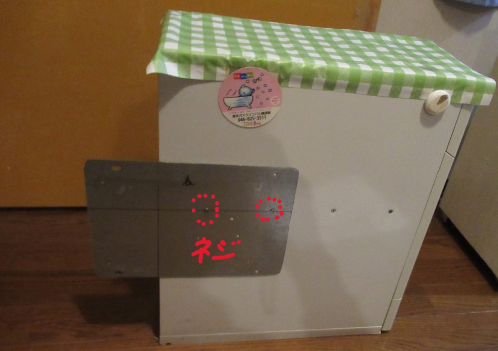 鉄板には、ネジ穴を2か所開けました。米びつの側面にこの鉄板を両面テープと米びつのネジ2本でくっつけます。