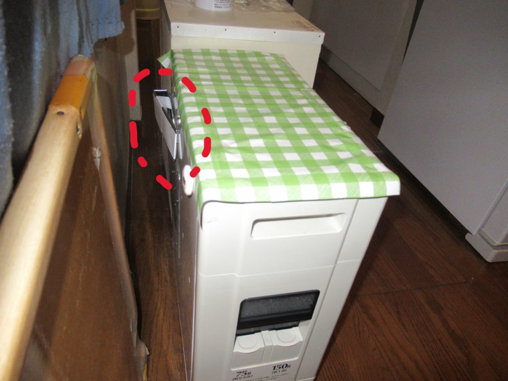 鉄板を米びつの側面に取り付けました。米びつから鉄板がはみ出しているのは、隣に置く収納ボックスが米びつより外に飛び出さないようにするためと、仕切り板が収納ボックスに当たるのを防ぐためです。物入と鉄板は固定しません。