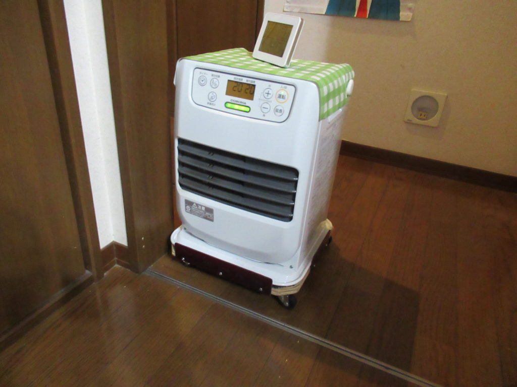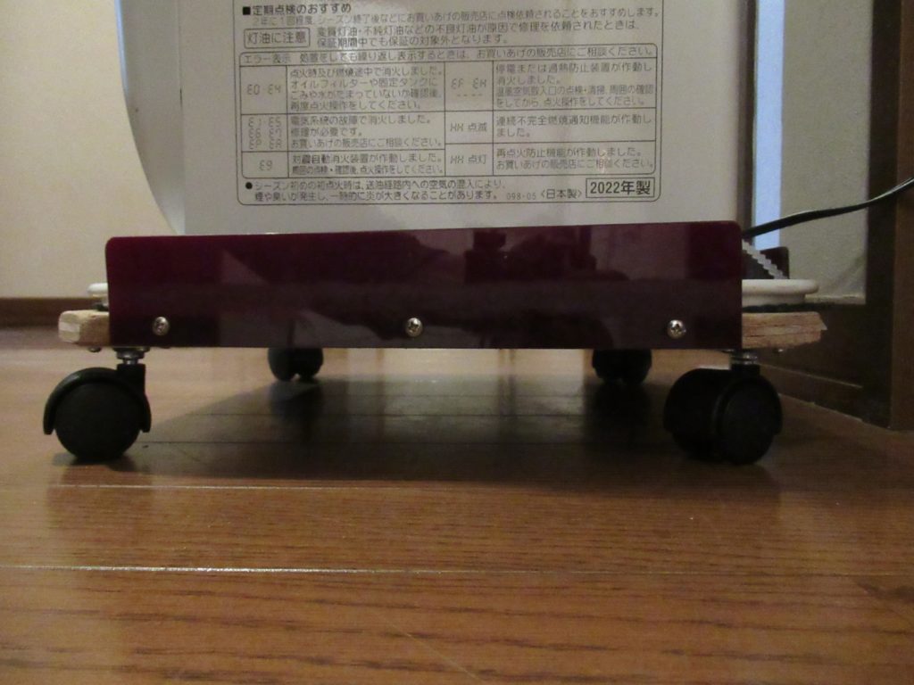 前回のブログ(12月16日投稿)で紹介しましたが、ファンヒーターを使用中に少し移動しただけで、耐震装置が作動して消火してしまうので、大きい車輪のキャスターに交換しました。