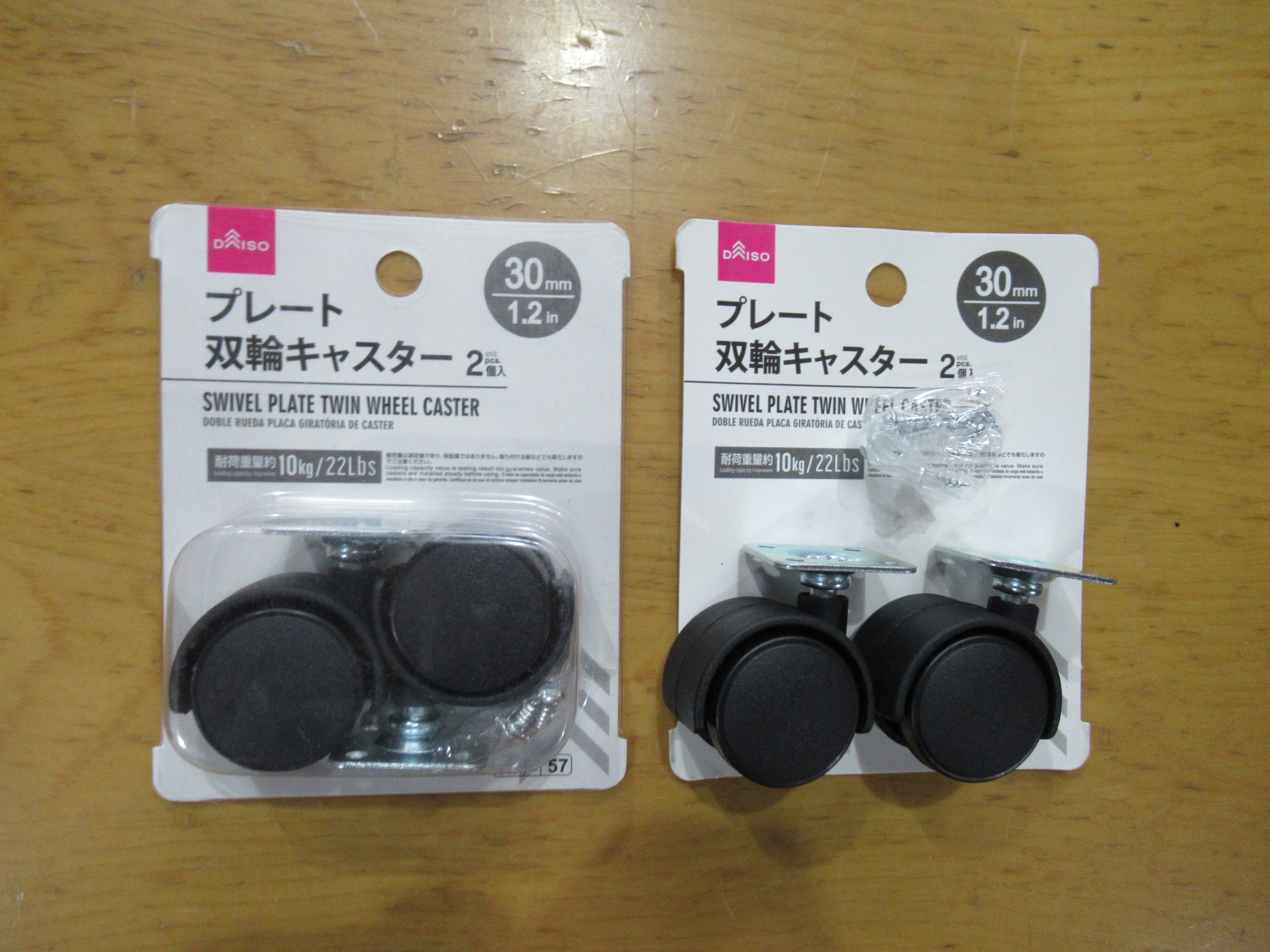 妻からもキャスターを交換したら、台の動きが悪くなったと言われました。そこで、仕方なくキャスターを再度交換することにしました。自宅でストックしている物の中で使えそうなのは、プラスチック製の双輪キャスターです。 100均でこのキャスターは2個で100円ですが、動きの悪い現在のキャスターはボールベアリングが使われていて1個100円です。 この双輪キャスターの方が安価だし、期待できないのですがとりあえず交換してみます。