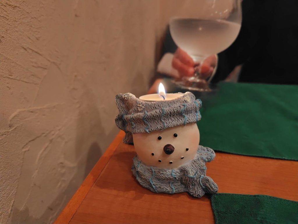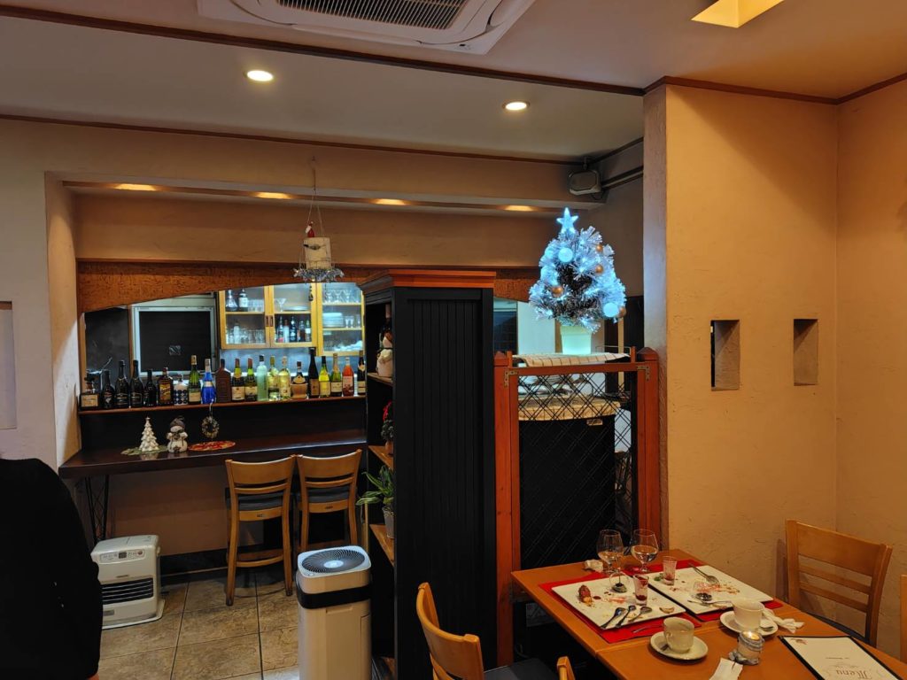 店内は家族連れや男女2人の客で満席に近い状態でしたが、我々の席が1つだけ空いていました。クリスマスの飾りやイルミネーションが綺麗で、落ち着いた雰囲気です。