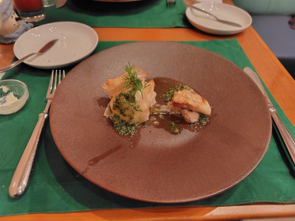 「帆立貝と蟹のムース仕立てと鮮魚の香草バター」です。香草(こうそう)バターとは、バターに刻んだ香草(ハーブ)やニンニク、その他の調味料を混ぜ合わせて作る、香り高い万能調味料です。