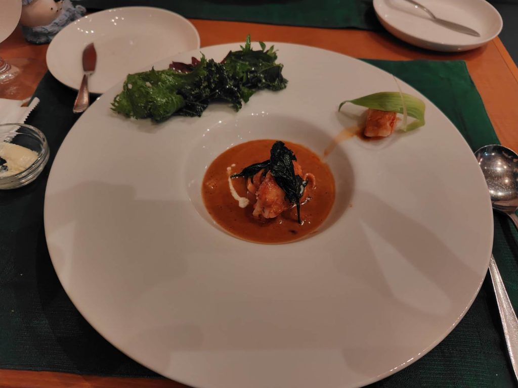 オードブル2品目は「赤海老のビスク ヌイユ添え」です。 (ビスクとはえびやかになどの甲殻類で作る濃厚なスープです。またヌイユとはフランス語で「麺」を意味して、特にフレンチで使われる平打ちの卵麺を指します。) スープは本当に濃厚で、ヌイユは平たいパスタですね。