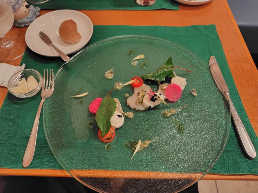 オードブル1品目は「タイラギ貝の炙りとリコッタチーズのムース キャビア添え」です。貝が柔らかくて、キャビアも美味しいです。