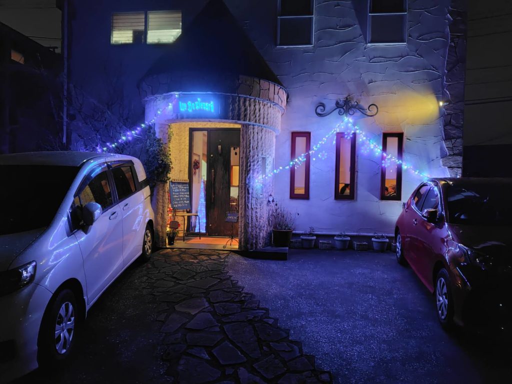 11月の初旬に妻が予約の電話をしましたが、すでにクリスマスイブの夜は予約でほぼ満席の状態でした。それでも二人ならと夜7時から席を確保してくれました。 ほぼ定刻に4輪で到着すると店の前の駐車スペースが左側1台空いており、帰りは妻の運転なので出やすいように停めました。