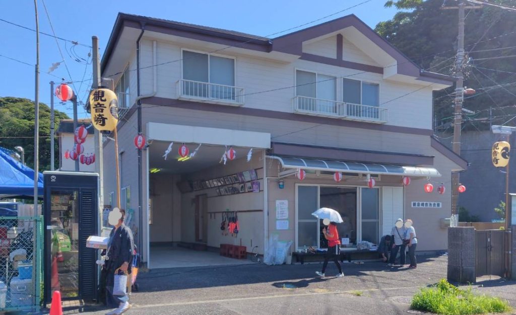 夏の祭礼時の町内会館です。2階建てで左側の大きな空間が神輿庫です。