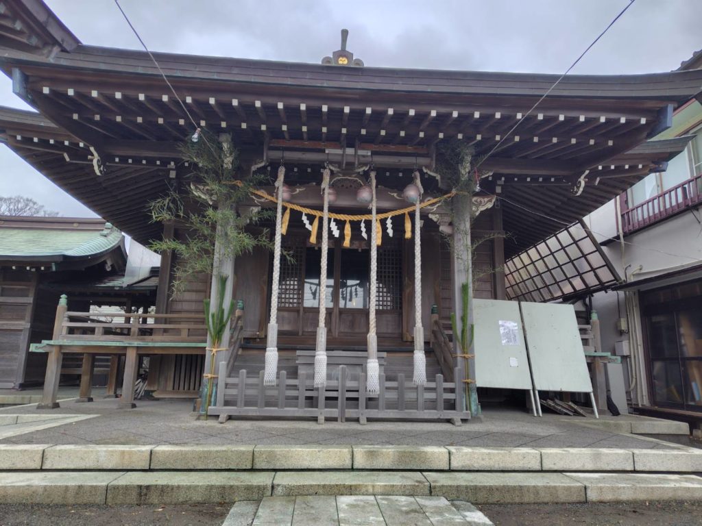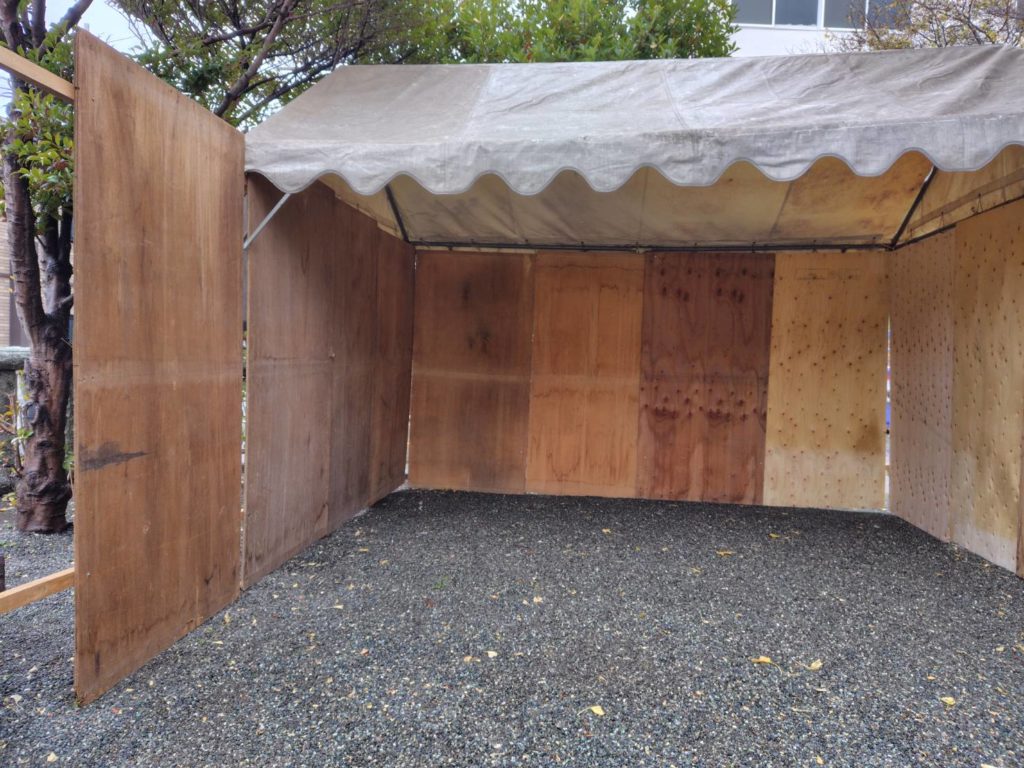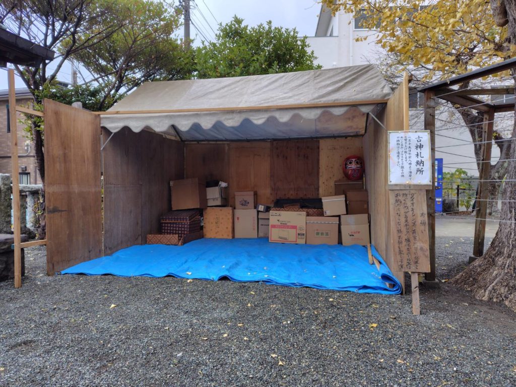 10町内の氏子総代が神社に集まり、境内の清掃やしめ縄貼り、古神札納所の設置を行いました。私は主に古神札納所の設置作業をしました。テントを張って、内側にベニヤ板で囲いを取り付けました。