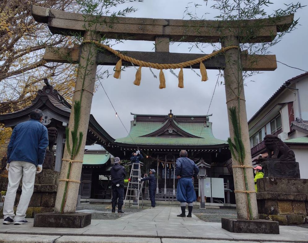 鳥居にも門松を設置して、正月の初詣客のために照明を取り付けました。朝9時から作業を始めて11時30分にすべての作業が終わりました。