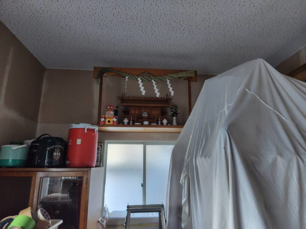 神輿庫の奥に神棚があります。 新しいしめ縄を張り、お米や塩・お酒を新しいものに取り替えて、お供え餅を置きました。 気持ちが改まりました。来年も我が町内を守ってくれることでしょう。