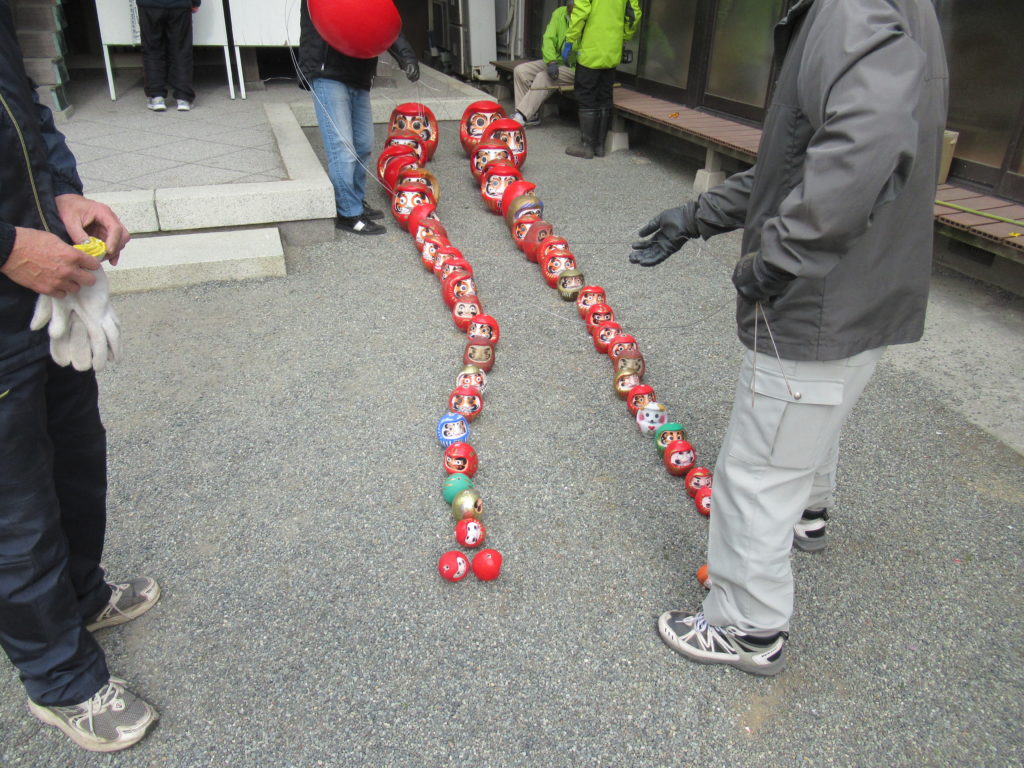 最後にだるまを吊るします。まだこの段階ではだるまの向きがバラバラですが、最上部を固定した後、だるまの顔を正面に向けました。