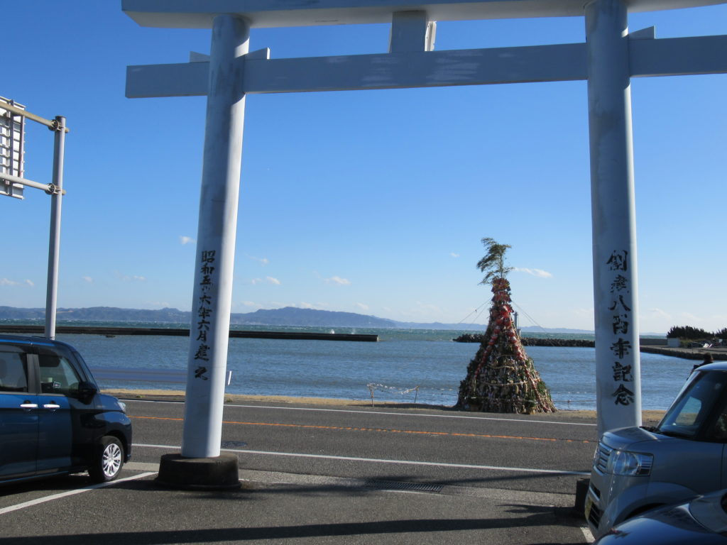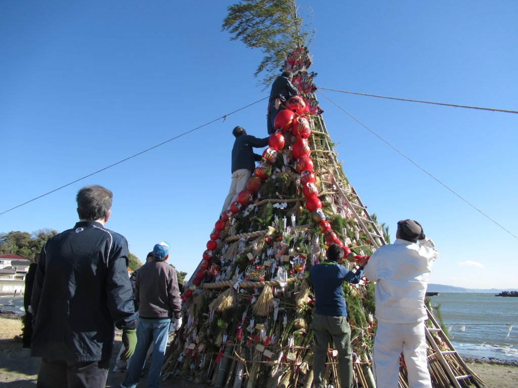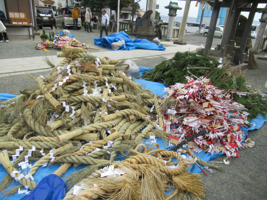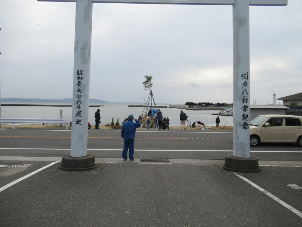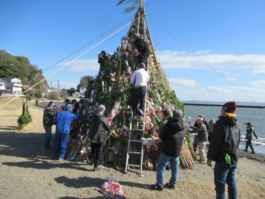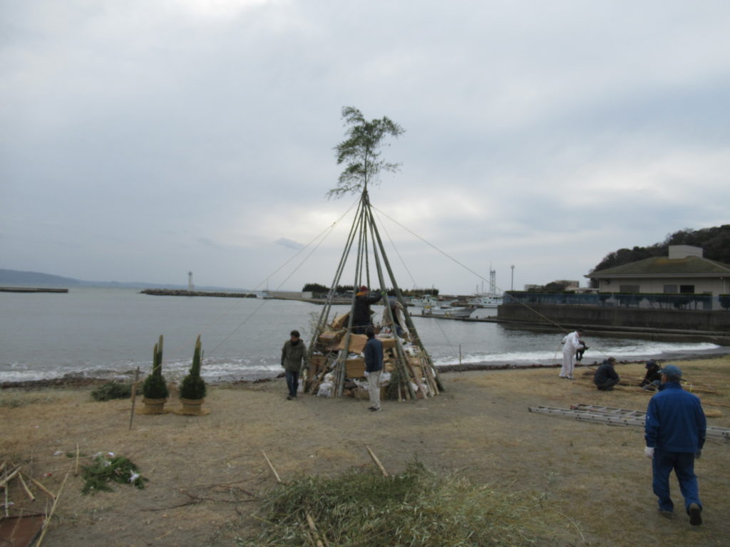 私達が境内で古神札納所の納められた物を仕分けしている間に、別のグループが浜に竹を組んで円錐形の塔を作り、その中に古いお札やお守り、松飾等を詰めていました。