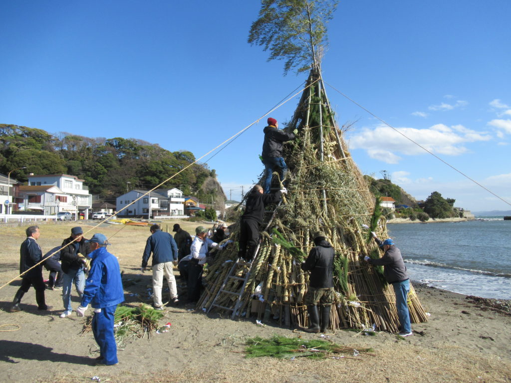 地元の鴨居八幡神社では、毎年1月15日に齋燈(さいと)「どんど焼き」の行事を行います。 古いお札やお守り、松飾等を神社前の浜にてお焚き上げをする神事です。 準備のため、1月11日各町内の氏子総代が神社に集合しました。